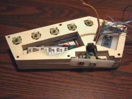 Because of my limited access to tools, the design was built of sheets of material routed out with a Dremel tool. What resulted is a 5 channel drum beat sequencer that taps out recorded beats on whatever surface it’s placed on. With an Arduino brain and 5 solenoids to do the tapping, the hand-held device